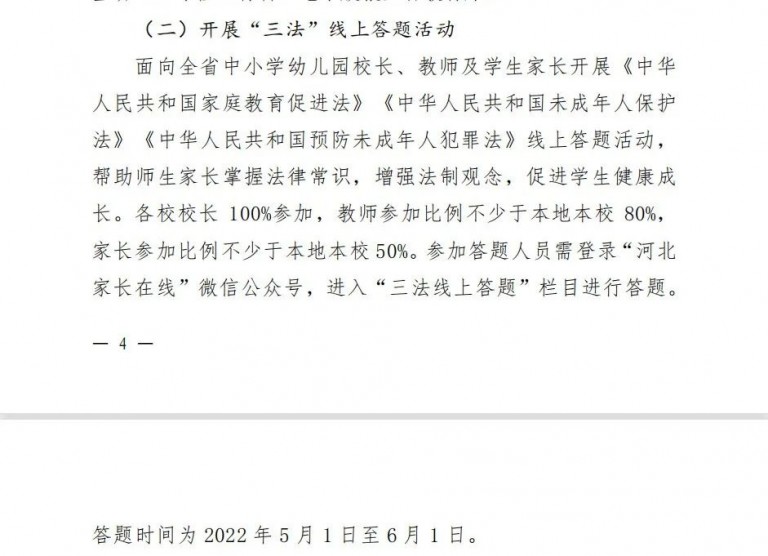 参与办法:关注“河北家长在线”微信公众号,进入“三法答题”栏目学习与答题。