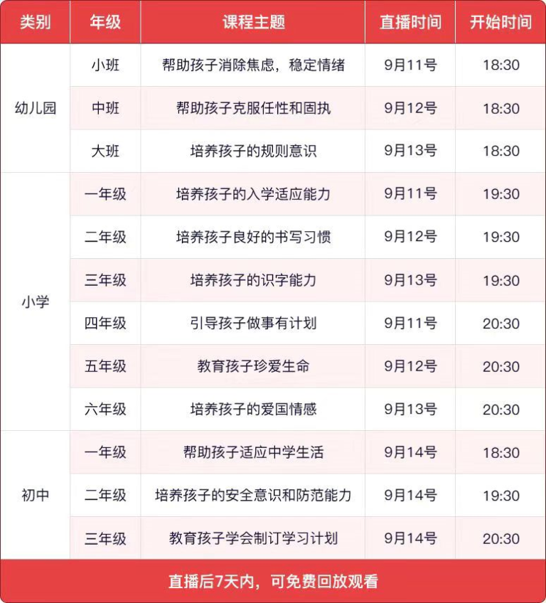 5. 课程自播出之日起7日内有效,过期将无法收看,请各位家长安排好时间及时收看。
