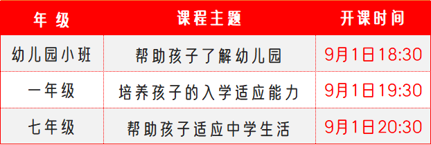 9月1日课程具体安排如下,请各位家长密切关注,及时收看。同时,建议家长们拿起教材《家长成长课堂》提前预习,这样学习的效果会更好。