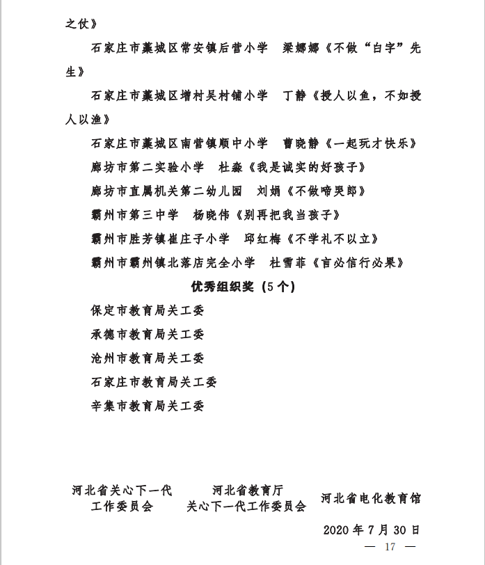 各市(含定州、辛集)关工委、教育局关工委、电教馆: